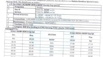 भोपाल। रक्षाबंधन पर्व के दौरान यात्रियों की अतिरिक्त भीड़ को देखते हुए पश्चिम मध्य रेलवे द्वारा विशेष रेलसेवा चलाने का निर्णय लिया गया है। गाड़ी संख्या 01661/01662 रानी कमलापति–रीवा–रानी कमलापति...