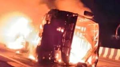 मैहर हाईवे पर बड़ा हादसा टला, चिंगारी से बस बनी आग का गोला
