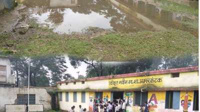विद्यालय में बच्चों के घुटनों तक बारिश का पानी भर जाता है