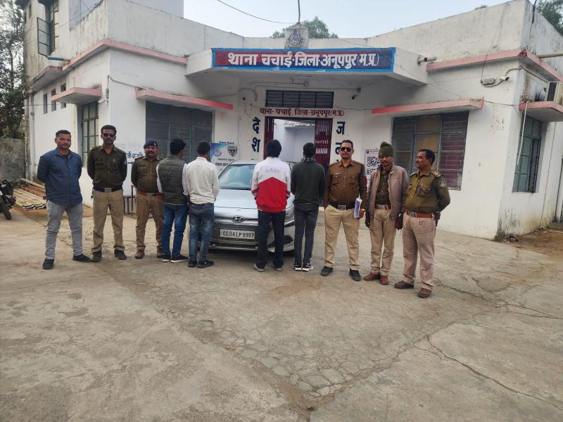 अनूपपुर / चचाई पुलिस को 03.02.2026 को मुखबिर से सूचना प्राप्त हुई थी कि अमलाई की तरफ से चचाई होते हुए अनूपपुर तरफ एक i20 हुंडई कार सिल्वर रंग की जिसका नंबर सीजी- 04 एल पी- 9997 से कुछ लोग अवैध मादक पदार्थ स्मैक का परिवहन कर रहे हैं सूचना की तस्दीक हेतु टीम बनाकर बताएं स्थान पर उक्त वाहन के आने का इंतजार कर रहे थे जैसे ही उक्त वाहन आया पुलिस टीम द्वारा रोकने का प्रयास की तो पुलिस को देखकर उक्त वाहन के चालक तेज गति से भागने लगा पीछा करने पर बाबा कुटी मंदिर के पास झाड़ियो की तरफ गाड़ी को भगा दिए जिससे घेराबंदी कर पकड़ा गया, उक्त वाहन में चार व्यक्ति बैठे हुए थे नाम पता पूछने पर उक्त वाहन के 01.चालक अपना नाम हरिकेश सिंह उर्फ मंत्री पिता दीप नारायण सिंह उम्र 35 साल निवासी तहसील के पीछे अनूपपुर, उसी के बगल सीट में बैठा व्यक्ति 02. अपना नाम राकेश कुशवाहा पिता स्वर्गीय लालमन कुशवाहा उम्र 36 वर्ष निवासी पुरानी बस्ती रोड अनूपपुर तथा बीच के सीट में बैठे व्यक्तियों से पूछताछ करने पर अपना-अपना नाम 03.संग पटेल पिता स्व. शेषनारायण पटेल उम्र 25 वर्ष निवासी पुरानी बस्ती अनूपपुर एवं 04. आकाश पटेल पिता उमेश पटेल उम्र 27 वर्ष निवासी खोली थाना चचाई जिला अनूपपुर का होना बताएं उक्त व्यक्तियों से एवं वाहन की तलाशी लेने पर संग पटेल के पास से 34 पुड़िया स्मैक के कुल वजन 5.67 ग्राम कीमती₹30000/-नगद 4940/- मिला, उक्त सभी आरोपियों से कुल पांच मोबाइल ,एक कार एवं नगदी सहित कुल कीमत 6,12090/- जप्त कर आरोपियों से पूछताछ करने पर आरोपियों द्वारा संगठित रूप से स्मैक शहडोल से खरीद करके अनूपपुर में लाकर बिक्री करना बताएं मामले में उक्त आरोपियों के द्वारा अपराध धारा 8b/22 एनडीपीएस एक्ट एवं 112(1) बीएनएस के तहत अपराध घटित करना प्रमाणित पाए जाने से आरोपियों को गिरफ्तार कर अभिरक्षा में लिया गया, उक्त आरोपियों के विरुद्ध तथा उक्त आरोपियों के द्वारा जहां से स्मैक खरीदे हैं उसे भी आरोपी बनाया जाकर आरोपियों के विरुद्ध अपराध पंजीकृत कर विवेचना में लिया गया ,आरोपियों को गिरफ्तार कर माननीय न्यायालय पेश किया गया है,,, उक्त कार्रवाई में थाना प्रभारी चचाई सुंद्रेश सिंह,उप निरीक्षक राघव बागरी ,सहायक उप निरीक्षक लालमणि चौधरी, रावेंद्र तिवारी, प्रधान आरक्षक विकास दहाय ,मोहन सिंह, आरक्षक विवेक मिश्रा, राकेश द्विवेदी की महत्वपूर्ण भूमिका रही है