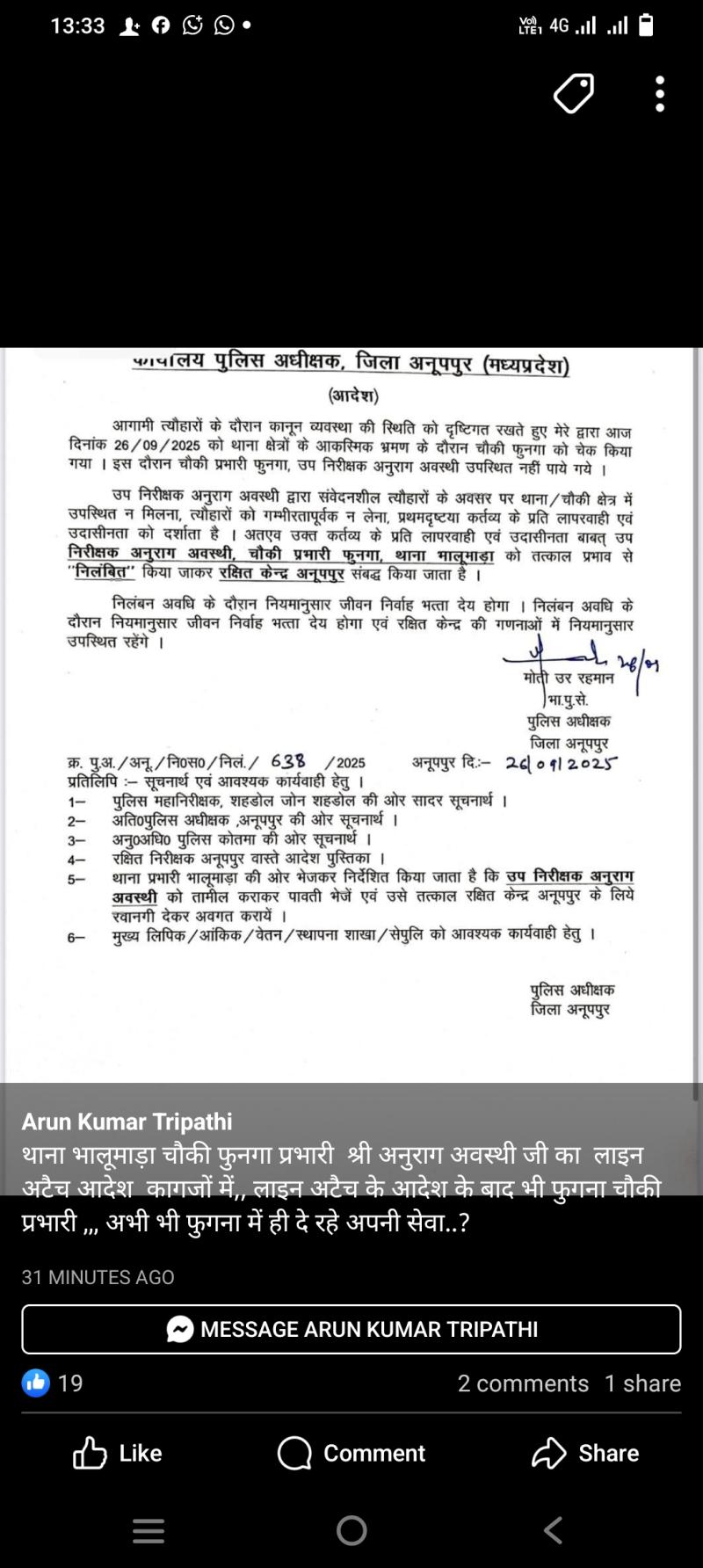 अनूपपुर / अनूपपुर पुलिस अधीक्षक ने फुनगा चौकी के प्रभारी को चौकी में अनुपस्थित पाए जाने पर निलंबित कर लाइन अटैच कर दिया गया है| जारी आदेश में लिखा गया कि आगामी त्यौहारों के दौरान कानून व्यवस्था की स्थिति को दृष्टिगत रखते हुए आज दिनांक 26/09/2025 को थाना क्षेत्रों के आकस्मिक भ्रमण के दौरान चौकी फुनगा को चेक किया गया। इस दौरान चौकी प्रभारी फुनगा, उप निरीक्षक अनुराग अवस्थी उपस्थित नहीं पाये गये ।