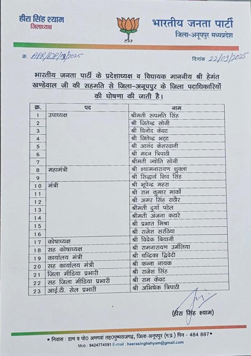*अनूपपुर भाजपा की जिला कार्यकारिणी घोषित