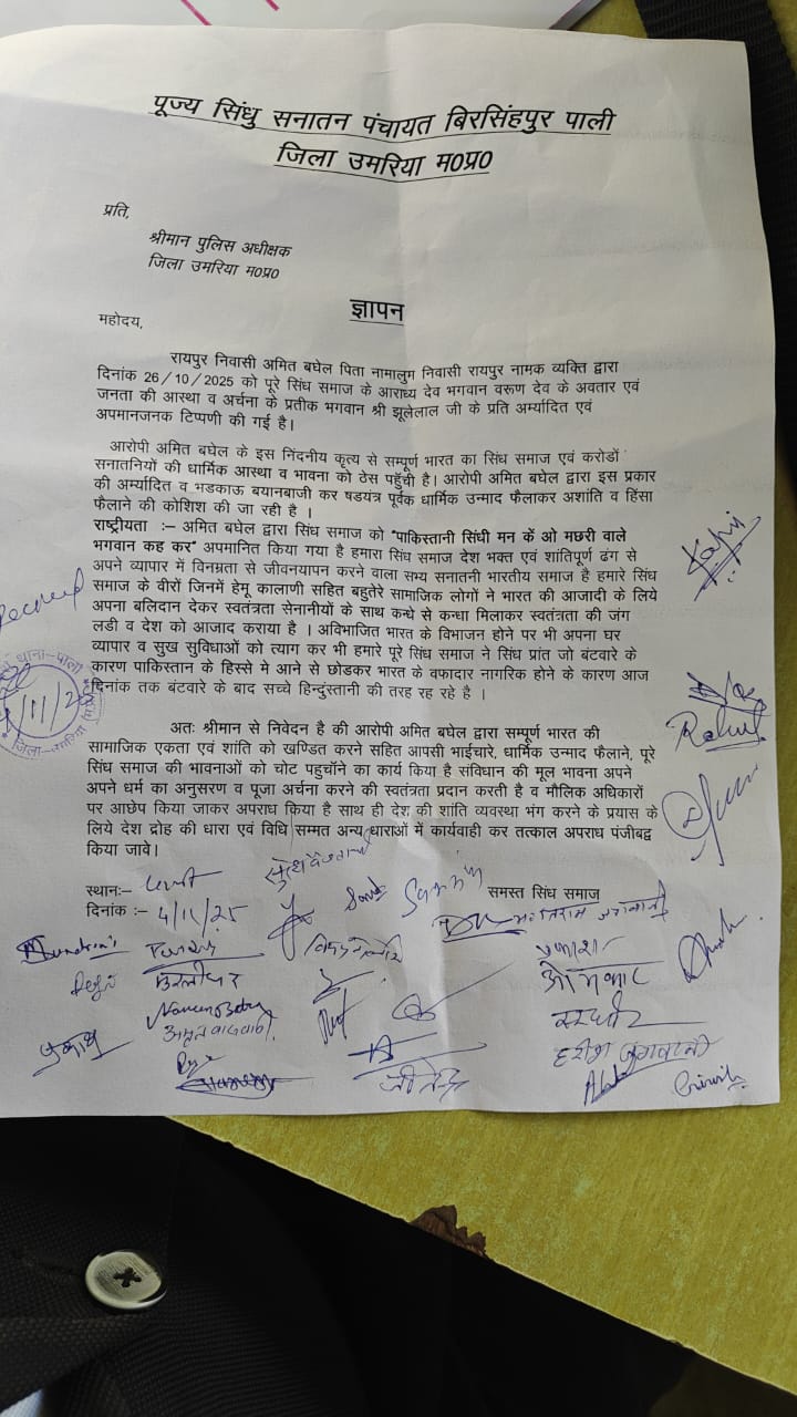 पाली (उमरिया)।पूज्य सिंधु सनातन पंचायत, बिरसिंहपुर — पाली के प्रतिनिधियों ने रायपुर निवासी अमित बघेल द्वारा भगवान वरुण देव और भगवान झूलेलाल जी के प्रति की गई आपत्तिजनक टिप्पणी के विरोध में पुलिस अधीक्षक उमरिया के नाम नगर निरीक्षक श्री राजेशचंद्र मिश्रा को ज्ञापन सौंपा।