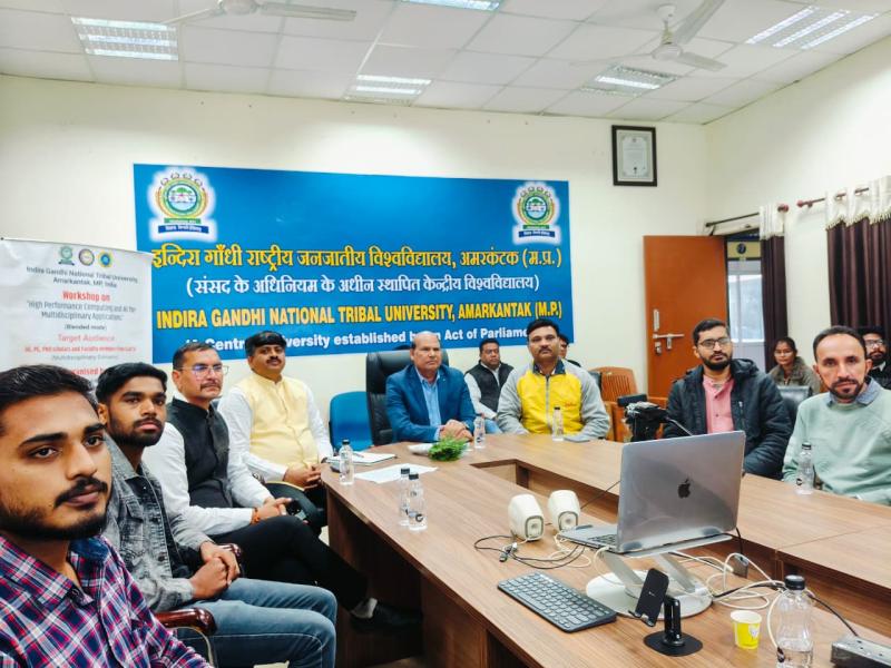 इंदिरा गांधी राष्ट्रीय जनजातीय विश्वविद्यालय में आज एचपीसी टेक्नोलॉजीज , सेंटर फॉर डेवलपमेंट ऑफ एडवांस्ड कंप्यूटिंग (सी-डैक) , पुणे के सहयोग से 'उच्च प्रदर्शन कंप्यूटिंग और एआई बहु- विषयक अनुप्रयोगों के लिए विषय पर एक कार्यशाला का सफलतापूर्वक आयोजन किया गया । यह मिश्रित-मोड कार्यक्रम , सुबह 10:00 बजे से दोपहर 1:10 बजे तक स्वामी विवेकानंद प्रशासनिक भवन में आयोजित किया गया , जिसमें विश्व विद्यालय के पीजी , पीएचडी की शोधार्थियों और संकाय सदस्यों सहित कई लोगों ने भाग लिया ।