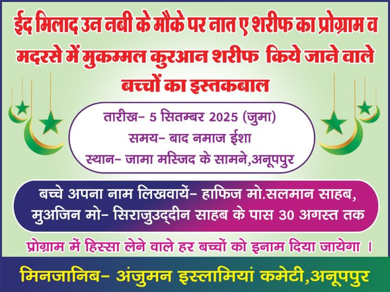 5 सितम्बर को जश्नें ईद मिलादुन्नबी के मौके पर अंजुमन इस्लामियाँ कमेटी अनूपपुर के जनिब से जिला वक्फ कमेटी के अध्यक्ष इरशाद अहमद व सदर मो लियाक़त अली की सरपरसती मे बाद नमाज मगरिब से बच्चों का नात, प्रोग्राम, मदरसे मे कुरान शरीफ मुकम्मल किये गए बच्चों का इस्तीकबाल, व इस साल कक्षा 10वीं व 12 वी पास बच्चों को इनाम का प्रोग्राम जामा मस्जिद के सामने रखा गया है वही 05 तारिख को जूनियर गुलाम-ए-मुस्तफा कमेटी की ओर से असर की नमाज के बाद विकलांग छात्रावास में फल वितरण का प्रोग्राम व 6 तारीख शनिवार को बाद नमाज जोहर के आम लंगर का इंतजाम जामा मस्जिद के सामने किया गया है किया गया है |