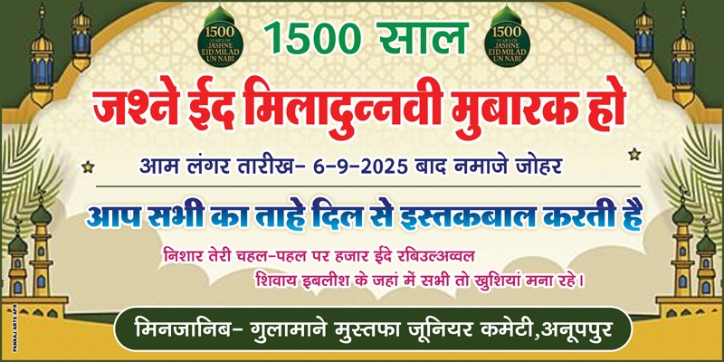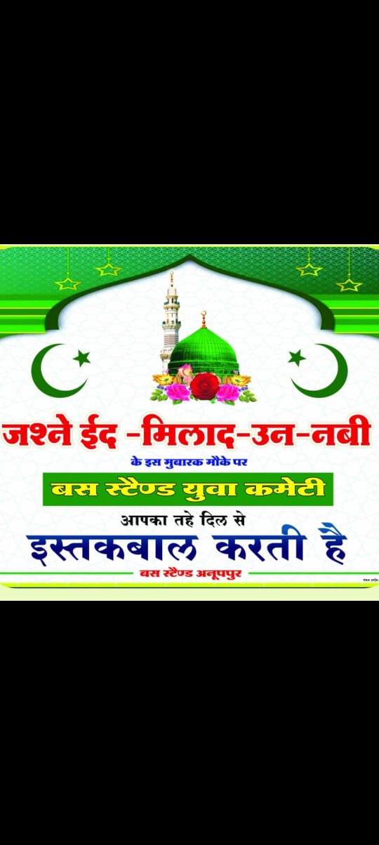 अनूपपुर / ईद मिलाद-उन-नबी मुस्लिम समुदाय का एक प्रमुख पर्व है। यह रबी-उल-अव्वल माह में मनाया जाता है, जिसे इस्लामी इतिहास में अत्यंत महत्वपूर्ण माना जाता है, इस साल पैगंबर साहब के जन्मदिन के 1500 साल पूरे हो रहे हैं जो कि अत्यंत खुशी का मौका है अनूपपुर मे बस स्टैण्ड युवा कमेटी दवारा तैयारीया नगर में बड़ी धूमधाम से चल रही हैं नगर को सजाया जा रहा है अनूपपुर बस स्टैण्ड को सजाया जा रहा है पुरे बस स्टैण्ड मे लाईटिंग की गई है इस अवसर पर जुमा की नमाज के बाद जुलूस का आयोजन मुस्लिम समाज द्वारा नगर में किया जाएगा जो की मस्जिद के सामने से होता हुआ थाने चौराहा, व बस स्टैंड जायेगा जहाँ पर बस स्टैंड युवा कमेटी दवारा जुलुस का जोरदार इस्तेबाल किया जाएगा यहाँ आम जन के लिए सुबह 10:00 बजे से शाम 4:00 बजे तक सिन्नी शर्बत व लंगर का माकूल इंतजाम भी कमेटी की तरफ से किया गया है |