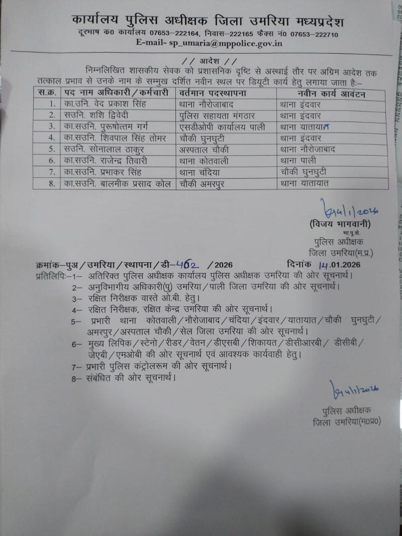 उमरिया पुलिस में 8 अधिकारियों के अस्थायी स्थानांतरण के आदेश जारी,,रिपोर्ट@राजकुमार गौतम उमारिया
