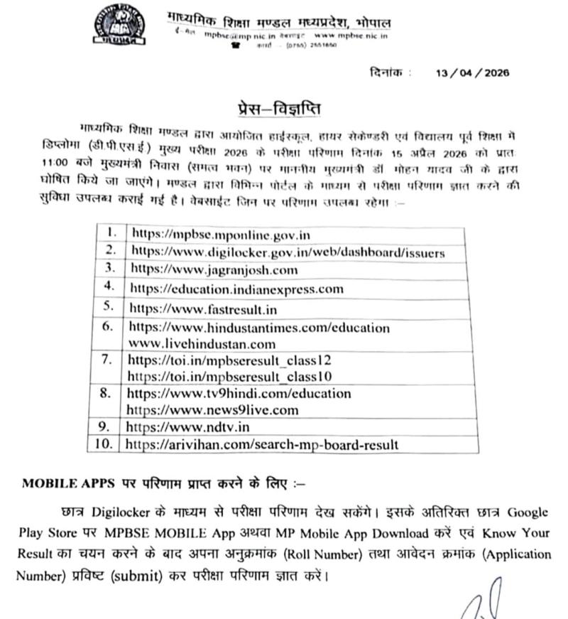 अनूपपुर / माध्यमिक शिक्षा मंडल मध्य प्रदेश द्वारा आयोजित आयोजित की गई वर्ष 2025-026 की हायर सेकेंडरी हायर स्कूल की बोर्ड परीक्षाओं का रिजल्ट कल 15 अप्रैल को प्रातः 11:00 प्रदेश के मुख्यमंत्री मोहन यादव अपने मुख्यमंत्री आवास से जारी करेंगे, परीक्षार्थियों को अपना रिजल्ट देखने के लिए माध्यमिक शिक्षा मंडल में विभिन्न वेबसाइट जारी की है जिनमे वे अपना रिजल्ट देख सकते हैं |