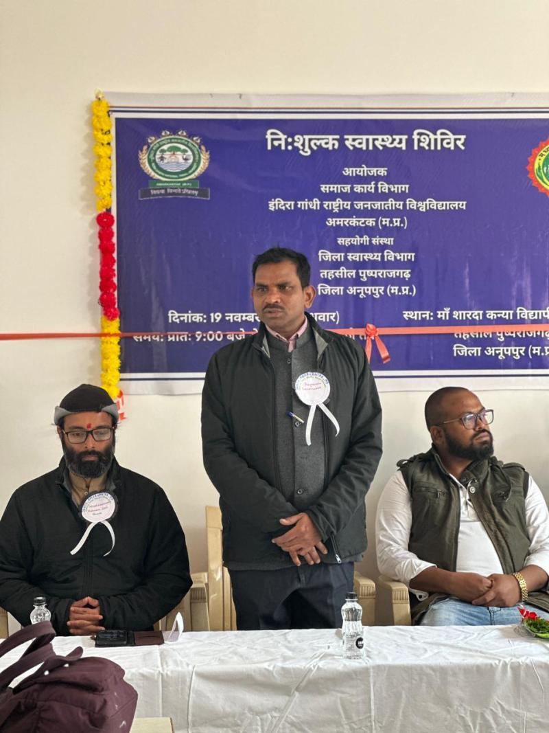 अमरकंटक - मां नर्मदा जी की उद्गम स्थली / पवित्र नगरी अमरकंटक के इंदिरा गांधी राष्ट्रीय जनजातीय विश्वविद्यालय (IGNTU) , अमरकंटक के समाज कार्य विभाग ने 19 नवम्बर 2025 को माँ शारदा कन्या विद्यापीठ , पोंडकी , अनुपपुर जिले में एक चिकित्सा शिविर का आयोजन किया था । इस शिविर का उद्देश्य आसपास की जनजातीय बस्तियों के लोगों को निःशुल्क स्वास्थ्य जाँच और आवश्यक चिकित्सा सेवाएँ प्रदान करना था । यह शिविर पुष्पराजगढ़ तहसील के ब्लॉक चिकित्सा कार्यालय के सहयोग से आयोजित किया गया था , जिसमें पोंडकी , भंडाकोना , कोगा , हर्राटोला और लालपुर सहित आस-पास के गाँवों के कुल 216 लोगों ने स्वास्थ्य सेवाओं का लाभ उठाया ।