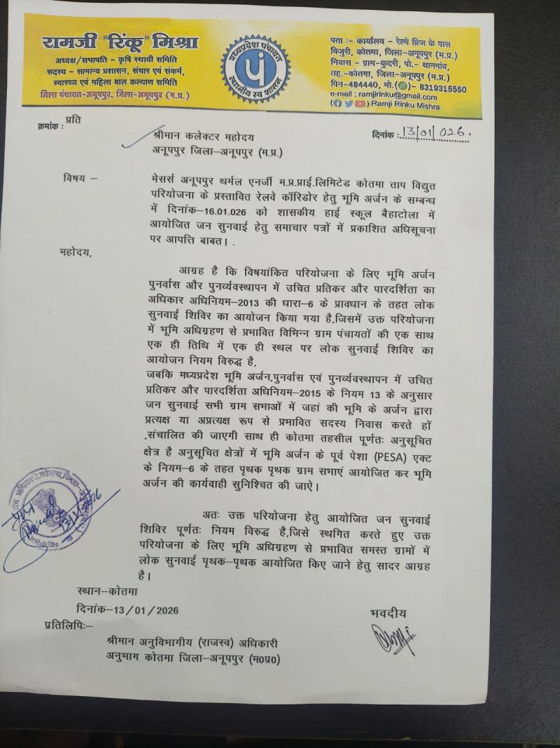 अनूपपुर - अनूपपुर जिले में प्रस्तावित अनूपपुर थर्मल ऊर्जा परियोजना को लेकर बड़ा विवाद खड़ा हो गया है। परियोजना के लिए भूमि अधिग्रहण की प्रक्रिया में कानूनी प्रावधानों की खुलेआम अनदेखी का आरोप लगा है। सामाजिक कार्यकर्ता रामजी रिंकू मिश्रा ने कलेक्टर को पत्र लिखकर 16 जनवरी 2026 को कोतमा स्थित शासकीय हाई स्कूल बैहाटोला में आयोजित जनसुनवाई पर कड़ी आपत्ति दर्ज कराई है।