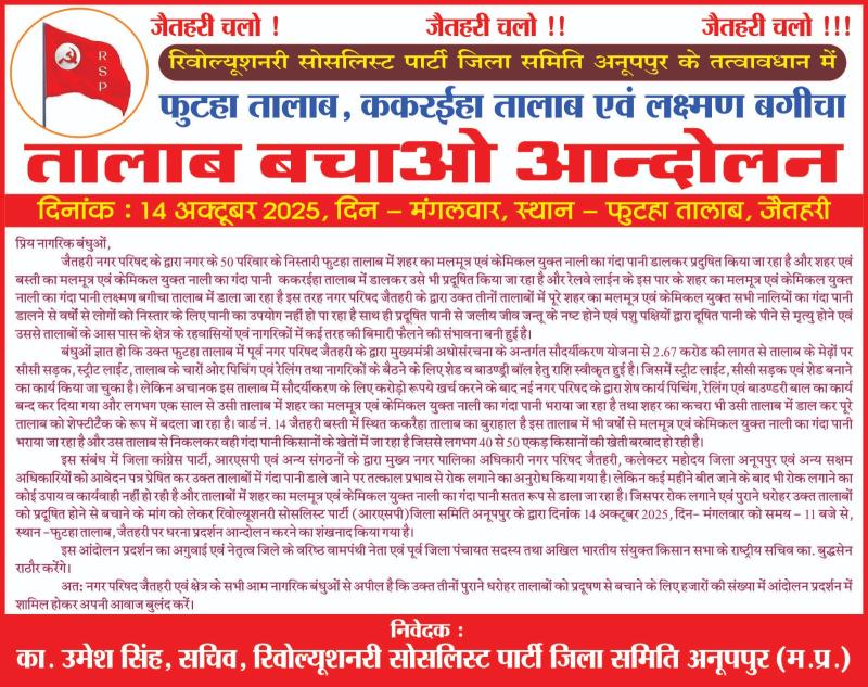 पार्टी ने 14 अक्टूबर, मंगलवार को “तालाब बचाओ आंदोलन” का ऐलान किया है, जो फुटहा तालाब, जैतहरी से शुरू होगा। आंदोलन में स्थानीय नागरिक, किसान, युवा और समाजसेवी बड़ी संख्या में शामिल होंगे।