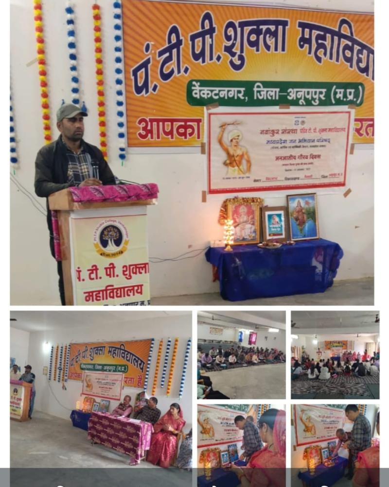 अनूपपुर वेंकटनगर/- भगवान बिरसा मुंडा की 150वीं जयंती के अवसर पर पंडित टी पी शुक्ला कॉलेज में जनजातीय गौरव दिवस का भव्य आयोजन किया गया। इस अवसर पर डॉ अनुज शुक्ला एवं मनीष शुक्ला ने कहा कि भगवान बिरसा मुंडा ने जल, जंगल, जमीन के बारे में जागरूक किया और आदिवासी समुदाय को अपने हक की लड़ाई लड़ने की प्रेरणा दी ¹।