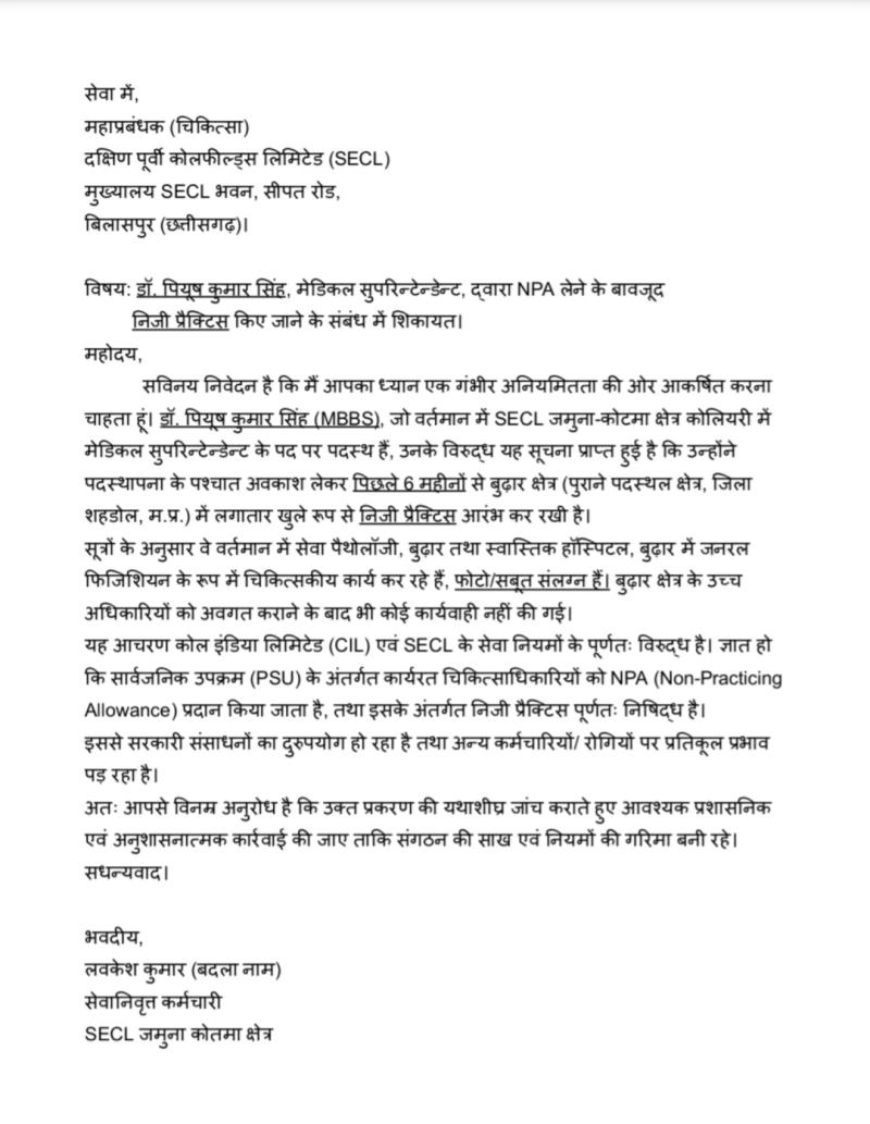 SECL के जामुना कोतमा क्षेत्र में तैनात डॉक्टर पर गंभीर अनियमितताओं के आरोप, निजी प्रैक्टिस का मामला उजागर