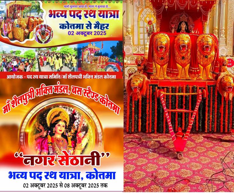 कोतमा - कोतमा पद रथ यात्रा सिमिति कोतमा के द्वारा माँ शैलपुत्री भक्ति मंडल कोतमा के सानिध्य में विगत वर्षों की भांति इस वर्ष भी माँ की पैदल रथ यात्रा 2 अक्टूबर को कोतमा से मैहर के लिए निकलेगी