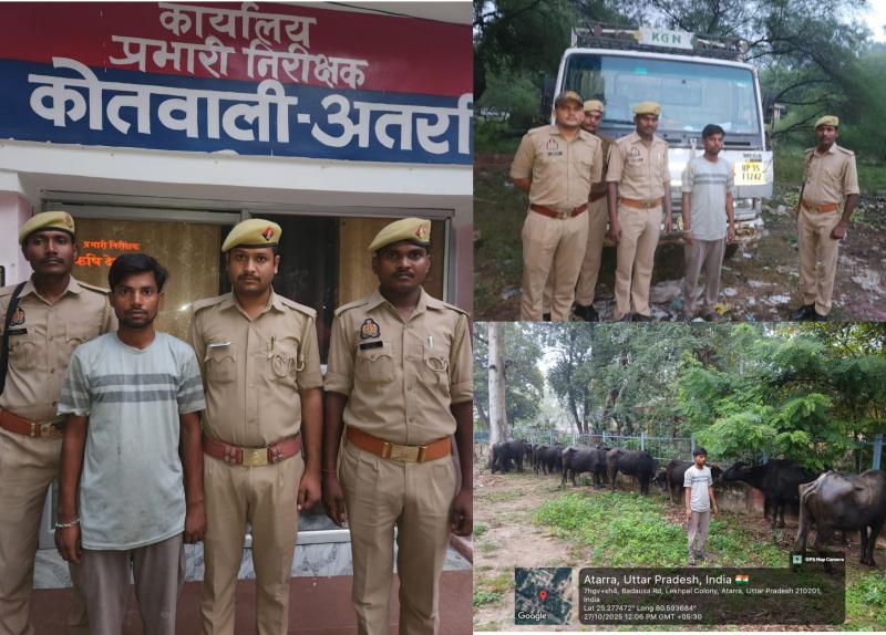 अतर्रा - पुलिस अधीक्षक पलाश बंसल के कुशल निर्देशन में जनपद में अपराध एवं अपराधियों पर नियंत्रण लगाये जाने के क्रम में आज दिनांक 27.10.2025 को थाना अतर्रा पुलिस द्वारा चेकिंग के दौरान मुखबिर द्वारा बताया कि एक व्यक्ति डीसीएम में क्रूरतापूर्वक पशुओं को लादकर नरैनी से बदौसा की तरफ ले जा रहा हैं सूचना पर त्वरित कार्यवाही करते हुए अभियुक्त को अतर्रा-बदौसा मार्ग मण्डी समिति के पास से गिरफ्तार कर लिया गया । डीसीएम से कुल 11 नग(भैंस/भैंसा) बरामद हुई हैं ।