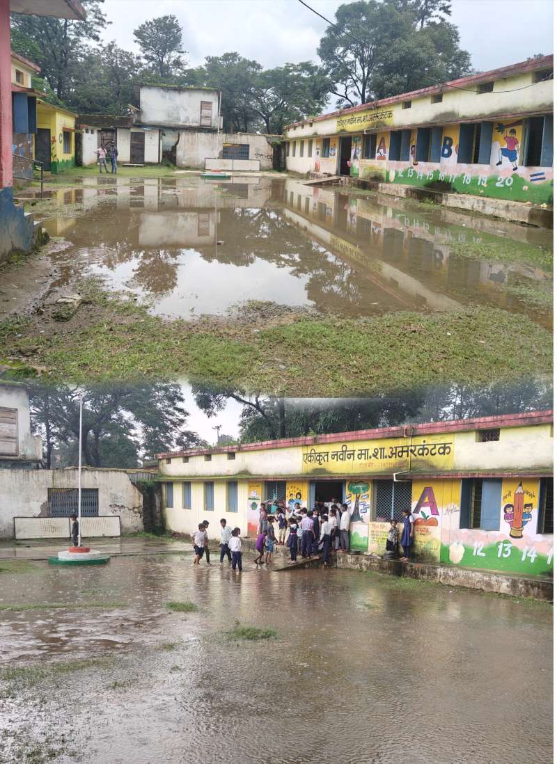 विद्यालय में बच्चों के घुटनों तक बारिश का पानी भर जाता है
