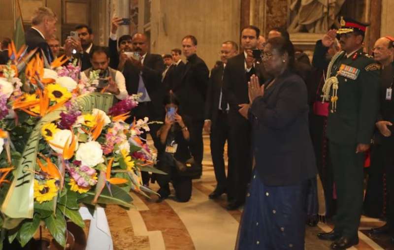 राष्ट्रपति की यात्रा के बारे में जानकारी देते हुए विदेश मंत्रालय के प्रवक्ता रणधीर जायसवाल ने तस्वीरें शेयर करते हुए एक्स पर लिखा, राष्ट्रपति द्रौपदी मुर्मू ने वेटिकन सिटी में सेंट पीटर बेसिलिका में परम पावन पोप फ्रांसिस को श्रद्धांजलि दी.