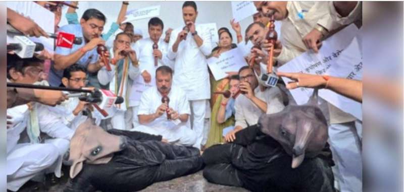 कांग्रेस ने विधानसभा में भैंस के सामने बीन बजाकर किया प्रदर्शन