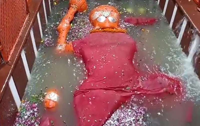 15 जुलाई दिन मंगलवार को दिन में करीब चार बजे पहली बार मां गंगा ने श्री बड़े हनुमान मंदिर में प्रवेश किया था। महंत बलवीर गिरि ने विशेष आरती कर मां गंगा का स्वागत किया। दो दिन बाद जलस्तर घटने के बाद मां गंगा 17 जुलाई बृहस्पतिवार को मंदिर से प्रस्थान कर गईं और साफ-सफाई के बाद मंदिर को श्रद्धालुओं के लिए खोल दिया गया था। कुछ ही घंटे के बाद बृहस्पतिवार की रात को 2.15 बजे जलस्तर बढ़ने के बाद गंगाजी ने पुन: मंदिर में पहुंचकर बजरंग बली को स्नान कराया। बृहस्पतिवार को दिन में मां ने प्रस्थान किया। इस तरह देखा जाए तो श्री बड़े हनुमानजी पहली बार दो दिन और दूसरी बार आठ दिन तक जल शयन में रहे। तीसरी बार नाग पंचमी को तीसरी बार माँ गंगा ने हनुमान जी को स्नान कराया है। महंत बलवीर गिरी ने विधि विधान से मां गंगा और बजरंगबली का पूजन अर्चन किया।