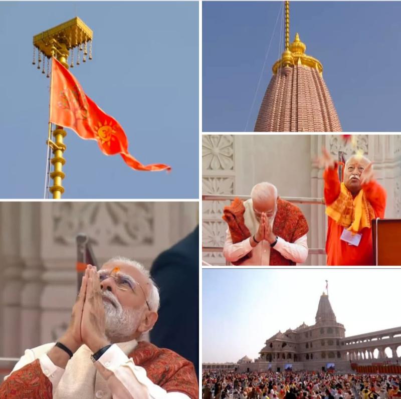 अभिजीत मुहूर्त के शुभ समय में श्रीराम मंदिर के शिखर पर धर्म ध्वज की स्थापना की गई। पीएम नरेंद्र मोदी ने शिखर पर भगवा ध्वज फहराया।