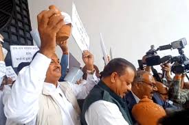 विधानसभा के सदन पर बजट रखने के पहले ही विपक्ष के सभी विधायकों ने हाथ में कर्ज का गुल्लक रखकर सरकार का विरोध किया है, विपक्ष के नेता प्रतिपक्ष का कहना है कि सरकार कर्ज में डूबी हुई है सरकार का खजाना पूरी तरह खाली है और सरकार के द्वारा प्रदेश की जनता का पैसा पानी की तरह बहाया जा रहा है. सरकार का जो बजट आ रहा है वह लोगों को गुमराह करने का बजट है।