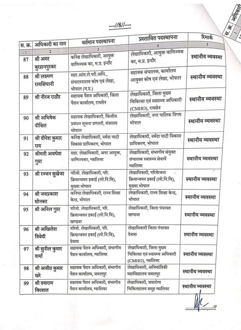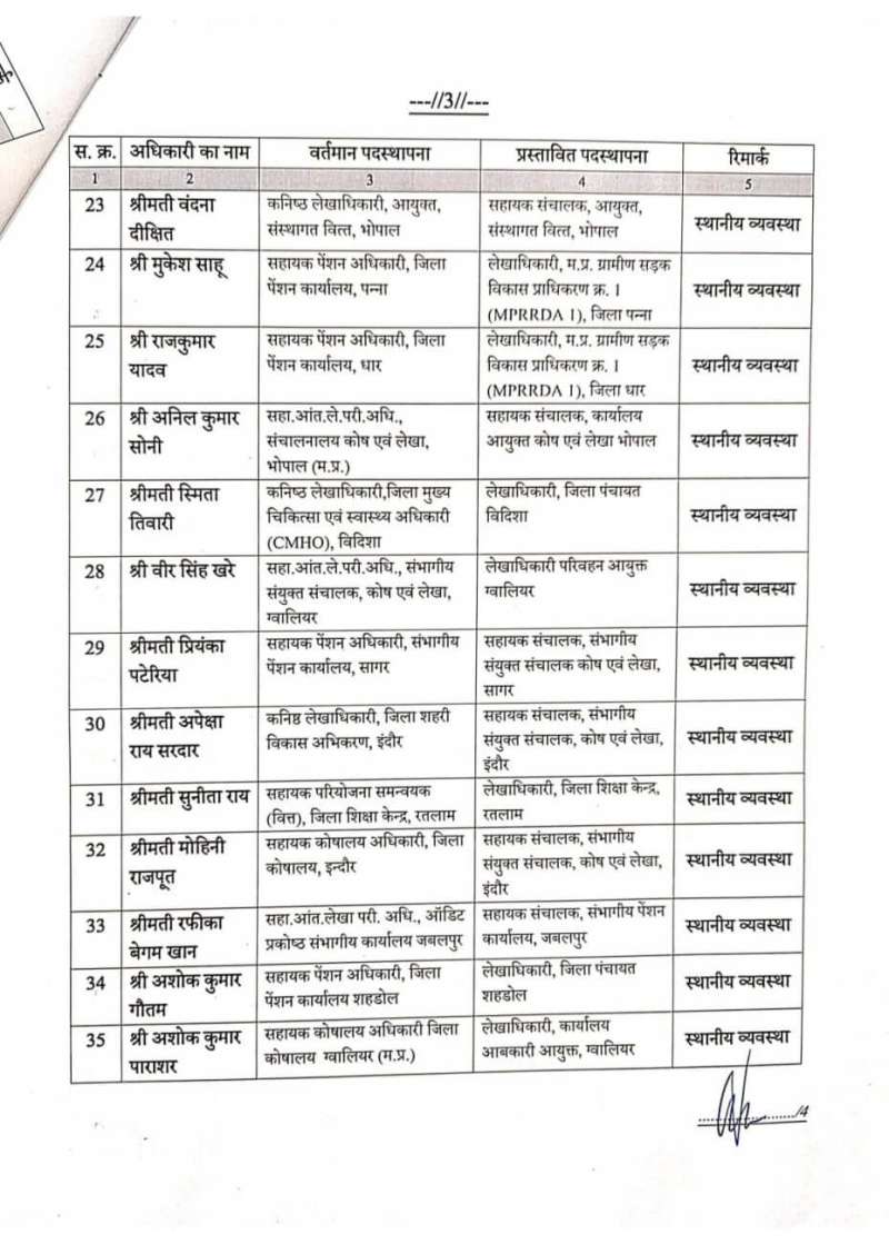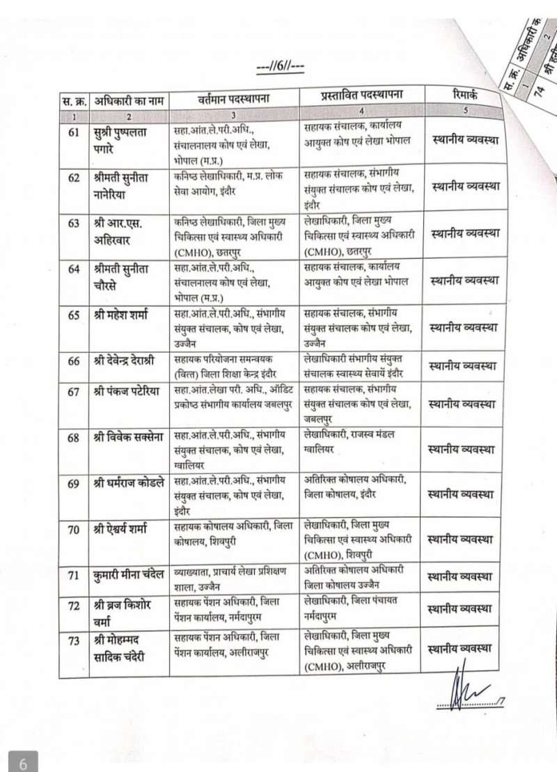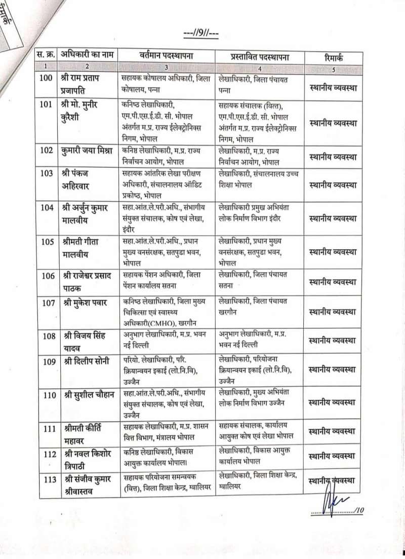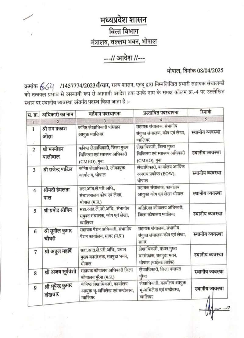 मध्य प्रदेश में देर रात फिर तबादला एक्सप्रेस दौड़ी है. राज्य शासन ने राज्यपाल के नाम से आदेश जारी करते हुए वित्त विभाग में थोकबंद तबादले किए हैं. मध्य प्रदेश की मोहन यादव सराकार ने कार्य सुविधा और प्रशासनिक कारणों का हवाला देते हुए सहायक संचालक स्तर के अधिकारियों को यहां से वहां किया है. वित्त विभाग में लंबे समय बाद इतनी बड़ी प्रशासनिक सर्जरी हुई है.