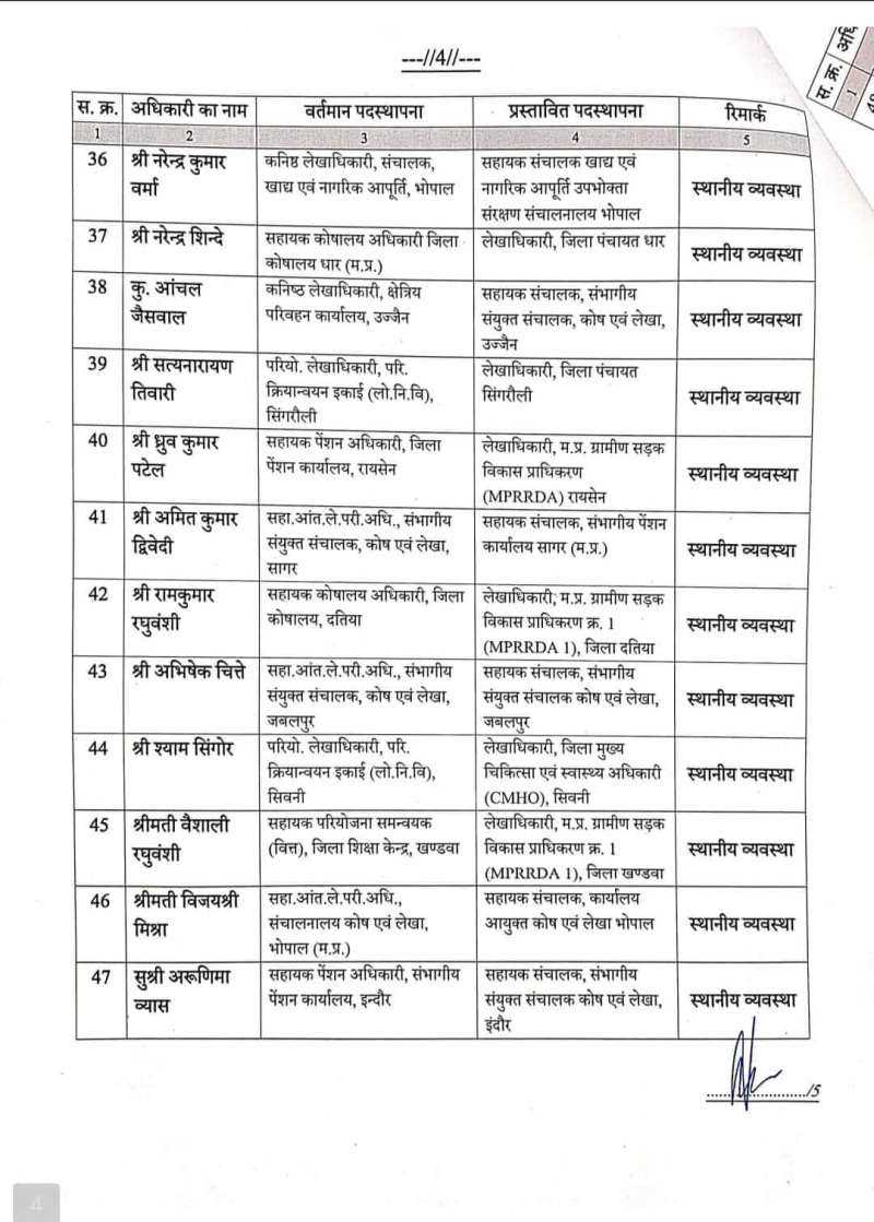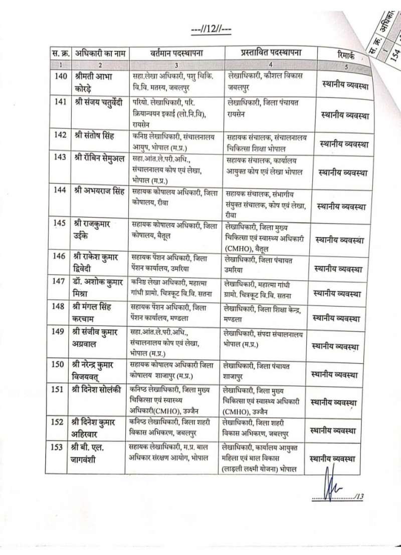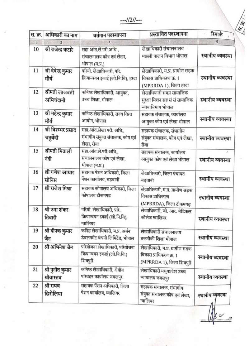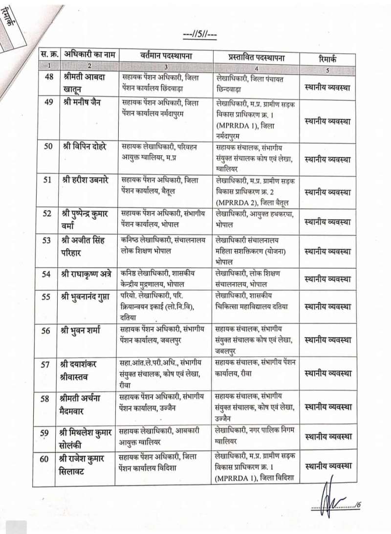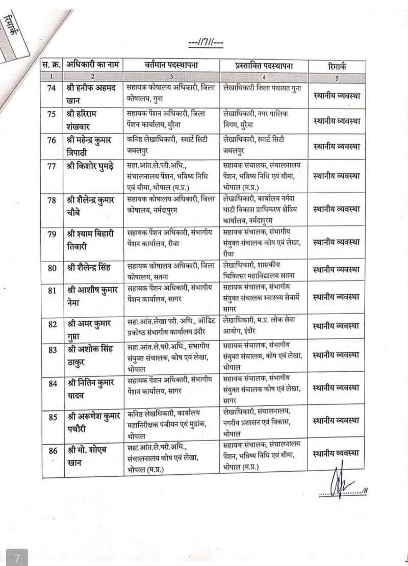 मध्य प्रदेश में देर रात फिर तबादला एक्सप्रेस दौड़ी है. राज्य शासन ने राज्यपाल के नाम से आदेश जारी करते हुए वित्त विभाग में थोकबंद तबादले किए हैं. मध्य प्रदेश की मोहन यादव सराकार ने कार्य सुविधा और प्रशासनिक कारणों का हवाला देते हुए सहायक संचालक स्तर के अधिकारियों को यहां से वहां किया है. वित्त विभाग में लंबे समय बाद इतनी बड़ी प्रशासनिक सर्जरी हुई है.